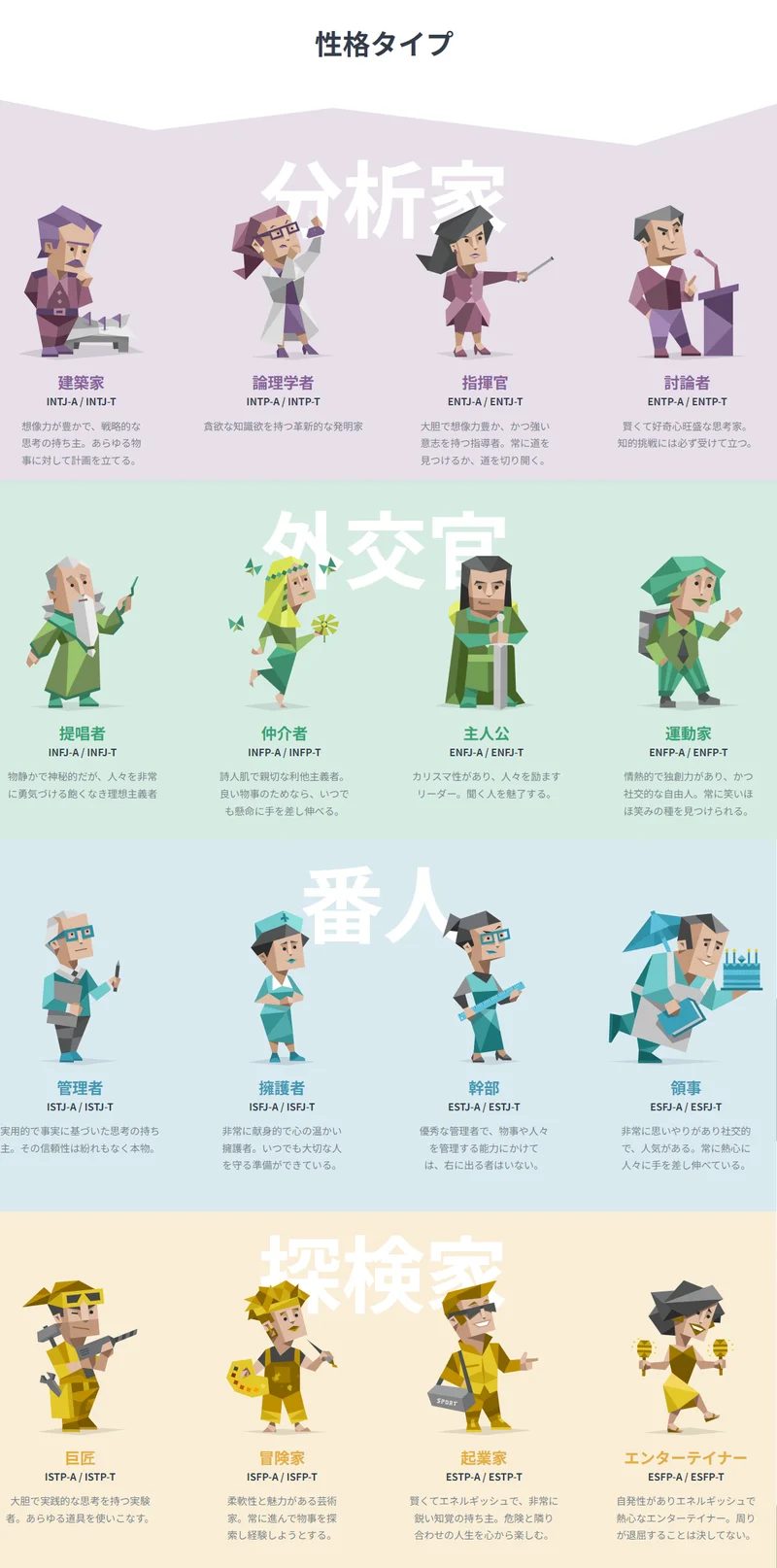 こういったキャラクターが考えられているようだけど、僕はどうせ、内向的で、理想主義で、論理やら規則やら大好きで、臨機応変なんて全くできない人間だから「建築家」になるだろうなと思っているよ。
