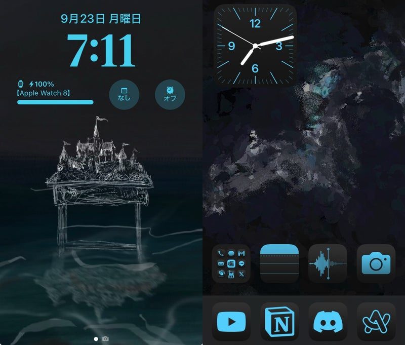 どちらの絵も僕が描いたものだけど、テーマカラーを鮮やかな水色に絞ったことと、アプリやフォルダの名称を隠せるようになったことで、パッと見の情報量はかなり減ったでしょ。加えて、好きな位置にアイコンを動かせるようになったことで、親指が届きやすい低い位置に持って来られて、ドックを増やしたような形になったよ。