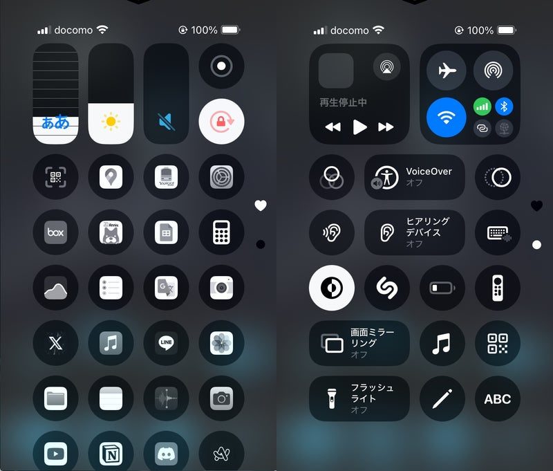 今回のアップデートの目玉とも思っているんだけど、コントロールセンターが大幅にカスタマイズ可能になったから、ホームには落選したものの、よく使うアプリは起動ショートカットとしてまとめておいたんだ。これは、下からスライドするだけでどんなアプリを開いている最中でも、取り出せるから、いちいちホームに戻ることもしないで、スムーズに機能を呼び起こせる。