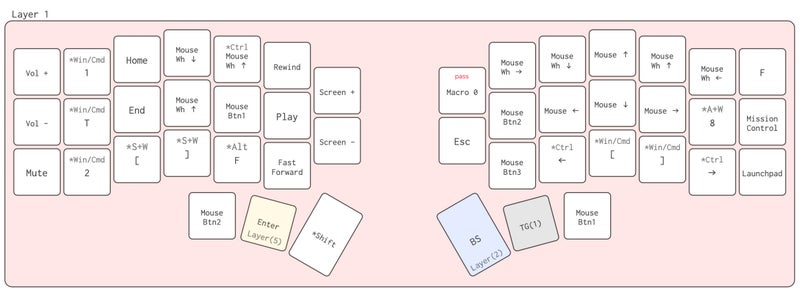 「Macro」と書いてあるものは、連続した色々な操作をワンタップ打てるように設定できるものなんだけど、15個しか搭載できなくて、僕的には足りなかったから、とりあえず自分のパソコンでしか使わなそうなものは、Karabiner-Elementsで 「F20」以降のキーに対する変換として設定した。(本当はファームウェアを書き換えるべきなんだろうな)