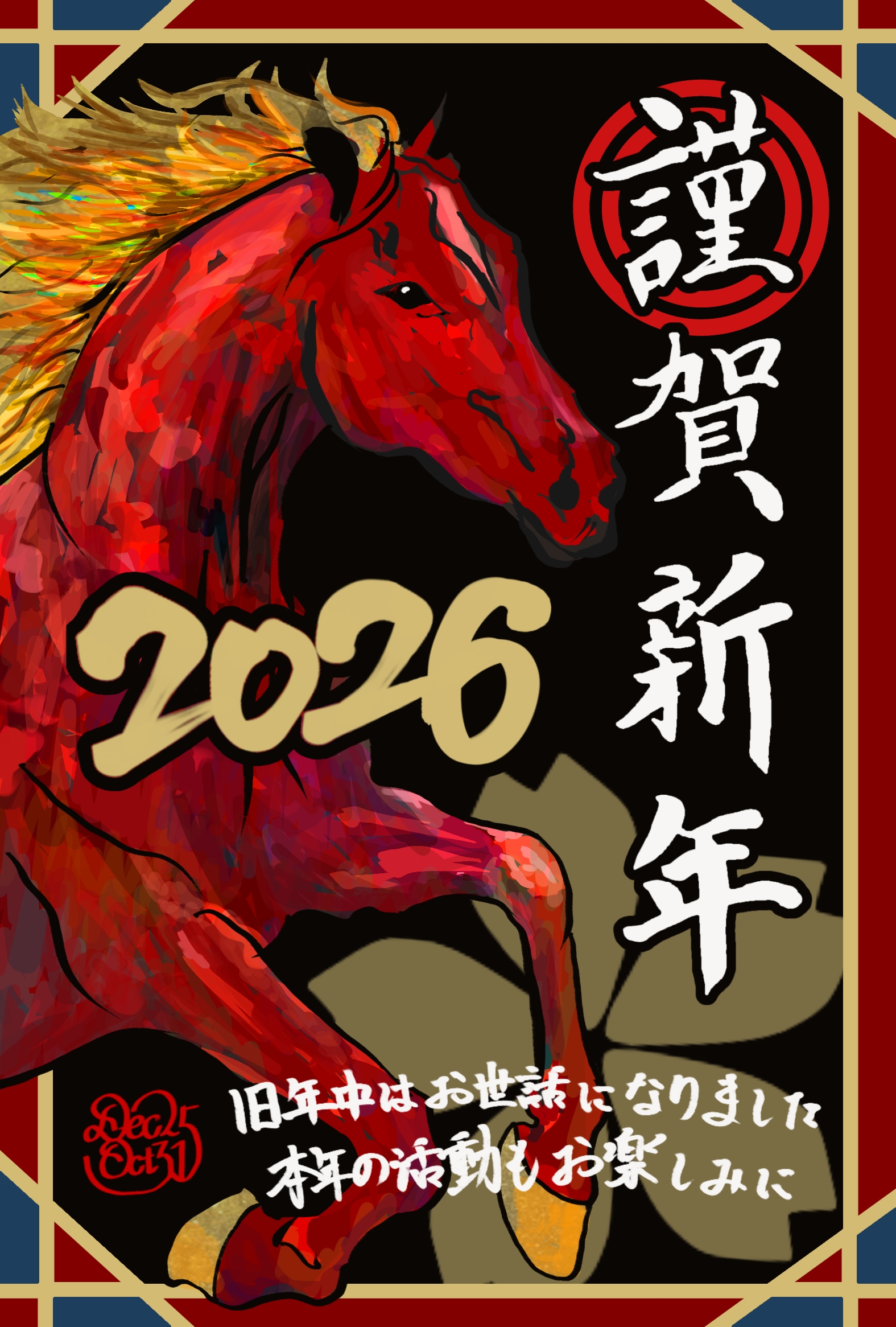 今年は「赤い馬」をモチーフにしてみた。魔除けだとか、活力に満ちているだとか、とても縁起のよいものだよ。だけど、放火の隠語など少し仄暗いメタファーでも使うようだね。今年は十干十二支で「丙午(ひのえうま)」だから、出生率がさらに下がるかもしれないなんてことも言われている。だけど、丙午って「丙」「午」どちらも火の性質を持っていて非常にパワフルであるって、普通に考えると素晴らしい年だと思うんだ。それを「この年に生まれた女性は気性が荒く不吉」なんて迷信に変えるのは曲解も甚だしいよね。僕の曽祖母は120年前の丙午生まれで、とても排斥されていたらしい。学校に通えず、校舎の窓から黒板を覗いていたなんて、歴史小説みたいな話も聞いたことがあるよ。